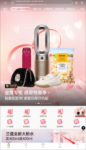 购物:到家服务,包括专柜、超市、海外购、积分兑换商品;