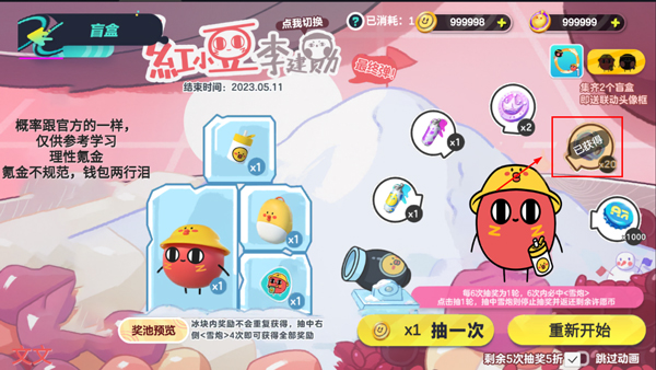 4、当成功抽取到右侧5个物品后即可抽取冰块冻住的红小豆,最多4轮即可抽到。