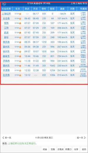 4、选择具体车次后即可查看详细时刻表、经停站点及实时运行状态信息。